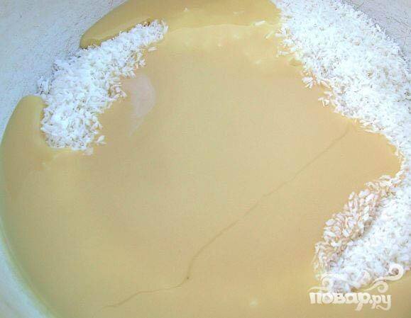 Шаг 1 1. Нам понадобиться глубокая миска. Высыпаем в нее кокосовую стружку, затем туда же выливаем сгущенку. Шаг 2 2. Все это хорошенько переминаем. Должно получиться что-то вроде кашицы. Минимум один час даем ей постоять (можно оставить и на большее время). Шаг 3 3. Орехи использовать здесь можно любые, мы используем фундук. Обжарим и очистим орехи. В отдельную посуду насыпаем кокосовой стружки, возьмем орехи и сладкую массу. Шаг 4 4. Сформируем лепешечку из сладкой кокосовой кашицы (она должна быть вязкой и лепиться), орешек укладываем в середину. Сжимаем ладонь и получаем шарик. Шаг 5 5. Подправим его немного и обкатываем в сухой кокосовой стружке. Шаг 6 6. Проделываем это с каждым шариком. Укладываем на блюдо и подаем к столу. Десерт готов.