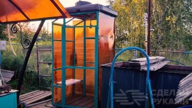 В данном обзоре расскажем, как быстро и недорого собрать душевую кабинку с летним душем для использования на дачном участке. Рассмотрим один из самых доступных и популярных вариантов: металлический каркас из профильной трубы, обшитый поликарбонатом. Причем металлокаркас можно сделать как сварным, так и разборным — скрепленный на металлических уголках. Но вариант со сваркой проще и надежнее.Первым делом необходимо будет отрезать по размеру заготовки из профильной трубы. После этого можно приступать к сборке каркаса. Сначала надо сделать опорную платформу 90*90 см для плоского бака, который одновременно является и крышей конструкцией. Можно, конечно, использовать вместе плоского бака бочку, но придется делать и крышу тогда. Свариваем основание душевой кабины из профтрубы 40х40 мм и толщиной не менее 2 мм. Затем привариваем к этому основанию четыре ножки примерно по одному метру длиной. К ножкам нужно приварить кусочки арматуры. Нижнюю часть основания нужно обязательно прогрунтовать и пок