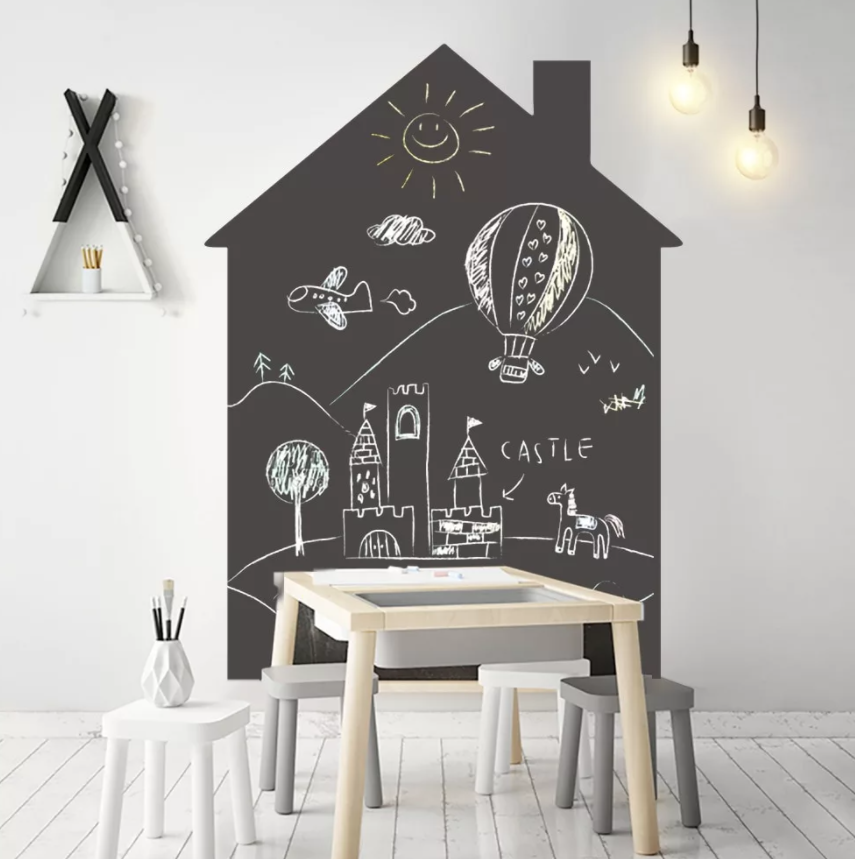 Говоря о детских многим в голову приходят сразу меловые доски, но такие доски лучше стоит использовать именно в переносном и ограниченном формате, а красить грифельной краской стены полностью не стоит. Дело в том что на черной грифельной стене остается много разводов от мелков и внешний вид помещения будет неаккуратным. К тому же после рисования мелками по стене, на полу остается много меловой пыли которая разносится по всей комнате. Поэтому в детских комнатах все таки стоит использовать доски переносные или если вы решили покрасить стену грифельной краской, то делать это стоит не на всю площадь стены, а небольшого размера