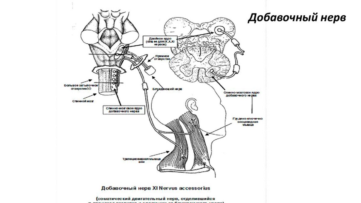 Нервная система координирует слаженную работу всего человеческого организма, а также отвечает за его «сотрудничество» с окружающим миром. Анатомически она разделяется на центральную (в которую входит мозг, спинной и головной) и периферическую (состоящую из нервов, их узлов, сплетений и пр.). Нервы – это собранные в пучки длинные отростки нейронов (нервных клеток). Один нерв содержит огромное множество таких волокон. В зависимости от своей функции нервы имеют разную длину и количество ответвлений. В спинном мозге берут начало нервы спинномозговые, а в головном – черепные. Всего насчитывается двенадцать пар черепных нервов. Еще одна, нулевая, пара рассматривается отдельно, так как она была открыта недавно, а ее назначение до сих пор точно не установлено. Каждая пара имеет свое специфическое название и номер, записываемый римскими цифрами. Различают чувствительные (передающие данные от органов чувств) нервы, двигательные (контролирующие работу мышц) и смешанные. Одиннадцатая (XI) пара — д