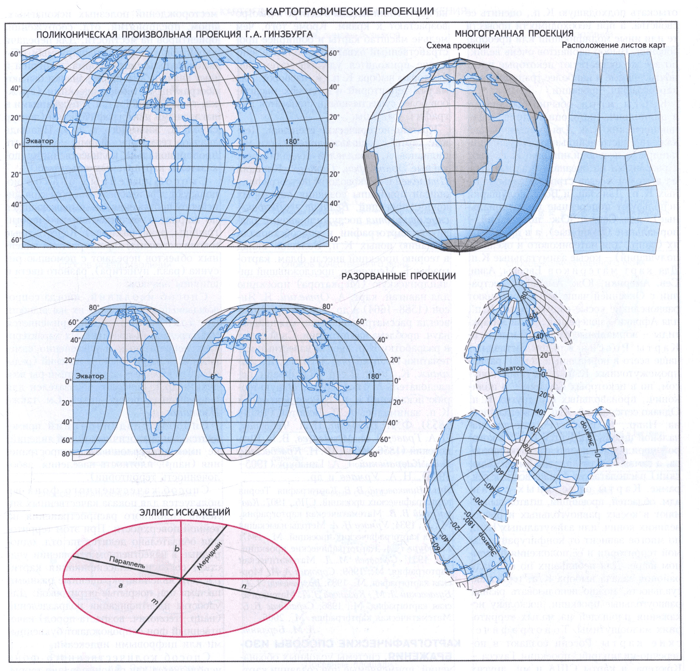 В основе любой картографической проекции лежит тот или иной способ изображения градусной сетки. На глобусе градусная сетка образуется меридианами и параллелями. Каждый меридиан пересекается со всеми остальными в двух точках — полюсах. Длины всех меридианов на глобусе равны. Экватор — окружность на поверхности глобуса, все точки которой отстоят от обоих полюсов на равных расстояниях. Параллели — также окружности на поверхности глобуса; все точки одной какой-либо параллели отстоят от экватора на одном и том же расстоянии. Длины параллелей различны: они увеличиваются при приближении к экватору и уменьшаются к полюсам. Все точки одного и того же меридиана имеют одинаковую долготу, но различную широту. Все точки одной параллели, наоборот, имеют одинаковую широту, но различную долготу.