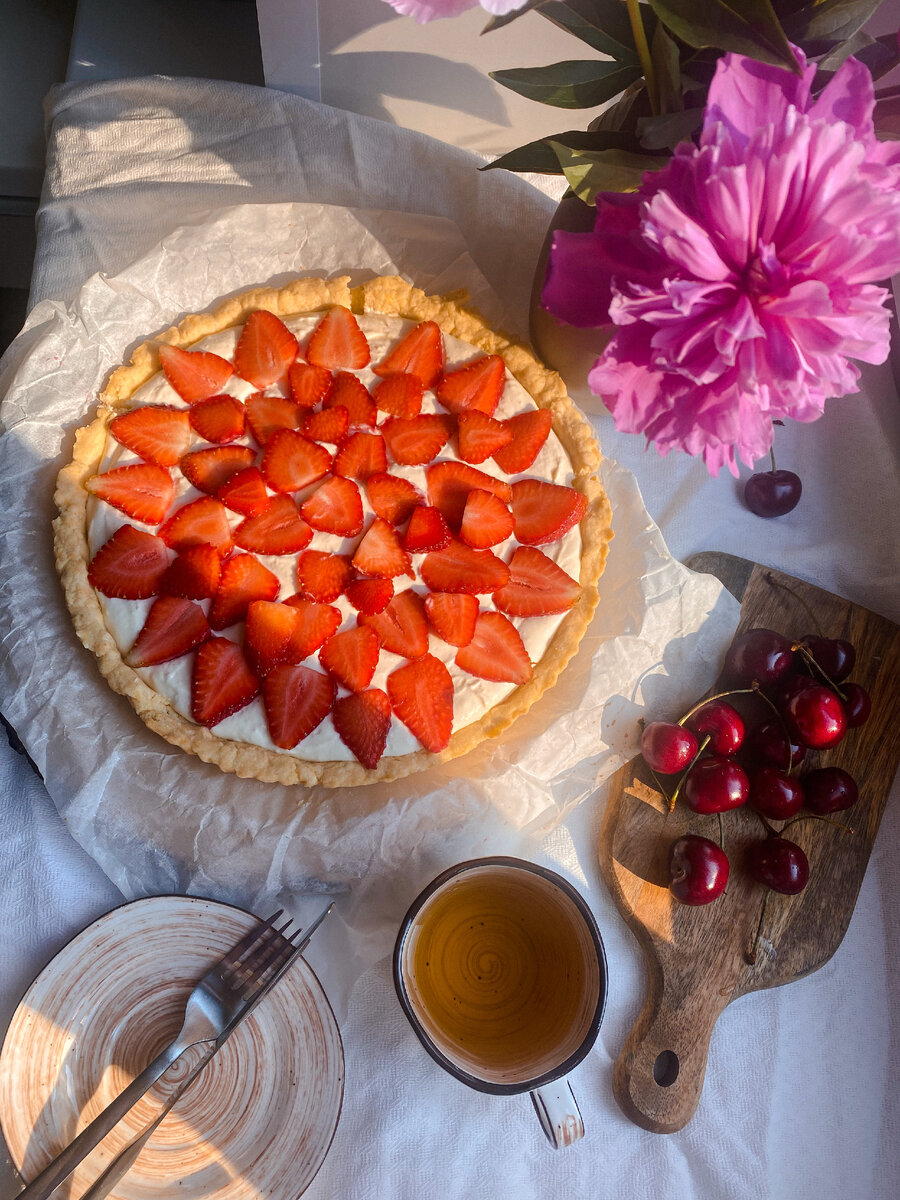 Вспомнила, про этот лёгкий летний тарт и захотела с вами поделиться☺️ Мне очень понравилось, что тарт готовится просто, а ингредиентов самый минимум. Для основы потребуется: Для крема: Приготовление: Муку просеиваем и смешиваем с сахарной пудрой. Добавляем холодное сливочное масло, порезанное кубиками. Смешиваем руками или миксером до состояния крошки. Добавляем яйцо и замешиваем тесто. Тесто скатываем в шар, заворачиваем в пищевую плёнку и убираем в холодильник на 30 минут. Затем охлаждённое тесто равномерно распределяем по форме 22-24 см, делая бортики. Прокалываем вилкой и выпекаем 15-20 минут при 180’. Для крема маскарпоне смешиваем с сахарной пудрой, добавляем сливки и взбиваем. На остывшую основу выкладываем крем и клубнику. Убираем в холодильник минимум на 1-1,5 часа и после подаём.