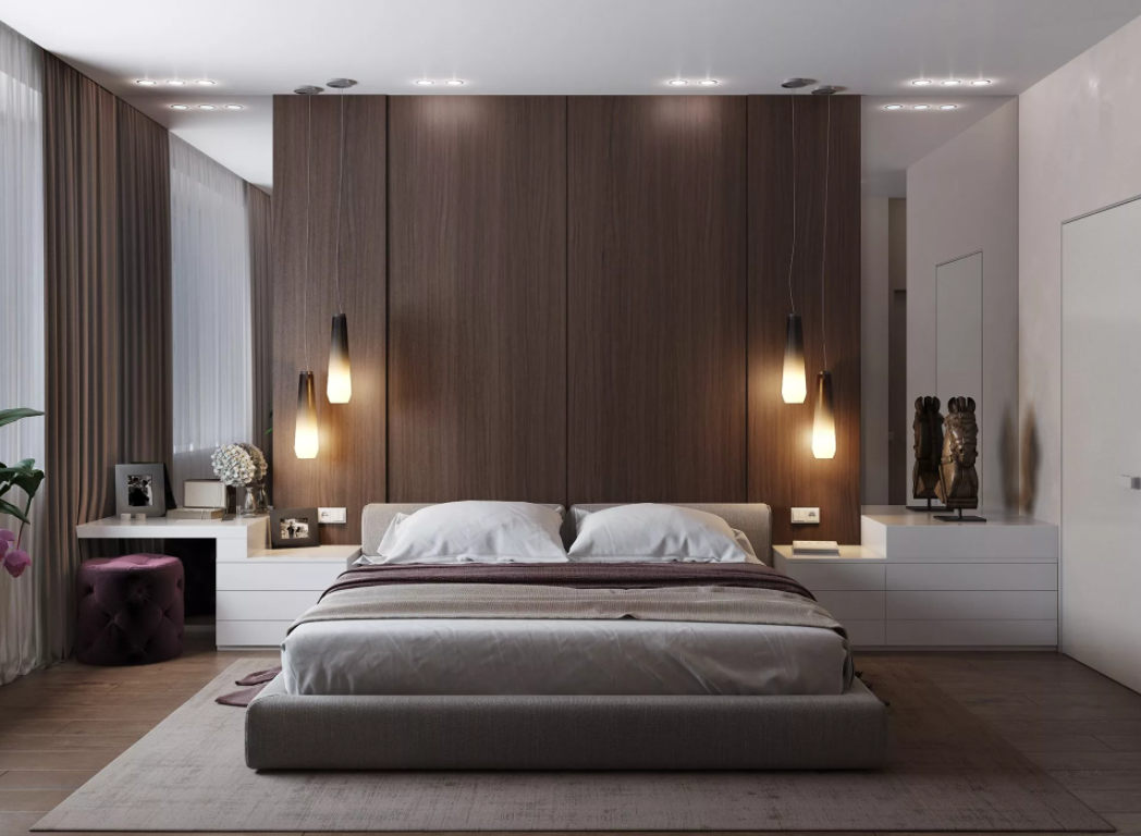 Я всегда советую подходить к дизайну спальни серьезно. Ведь здесь мы проводим почти треть своей жизни. Если повезёт, конечно, а то не всегда времени на сон хватает должна быть комфортной, уютной и настраивать на полноценный отдых. На фото именно такой дизайн-проект. Всё в нём словно шепчет: Остановись и отдохни.Спокойные тона в отделке и в расцветке мебели, много воздуха, зелень растений, огромная кровать и мягкий ковер на полу. Ощущение, как будто вы случайно уснули летним жарким днём на тенистой лесной полянке.При создании этого проекта мы столкнулись с глобальной проблемой в виде массивной бетонной балки, проходящей через весь потолок спасибо застройщикам!. Чтобы вписать ее в интерьер, придумали сложную конфигурацию потолка. Это конструкция из ГКЛ со встроенными светильниками и скрытой подсветкой. А где шкафы? можете спросить вы. Действительно, в проекте нет ни одногоЭто потому, что прямо из спальни две двери ведут в отдельные гардеробные, мужскую и женскую. Рядом с комнатой имел