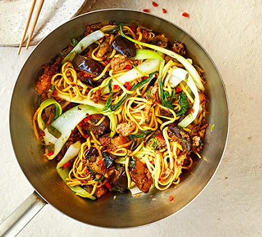 - Слить слившуюся лапшу с оставшимся стир-фраем в воке до тех пор, пока лапша не покроется соусом. Разделите между подогретыми мисками.