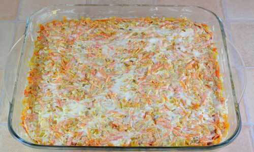 Фарш — 500 грамм; Рис — 150 грамм; Лук репчатый — 200 грамм; Морковь — 200 грамм; Капуста белокочанная — 200 грамм; Сметана — 100 грамм; Томатная паста — 3 столовых ложки; Куркума — 0,5 чайной ложки; перец — по вкусу; Масло растительное; Соль — по вкусу. Готовим запеканку с рисом и фаршем Первым делом нам необходимо отварить рис, но сначала хорошо помоем его, после чего в кастрюлю наливаем три чашки воды и засыпаем туда рис, делаем три к одному (на три чашки воды чашку риса). На данном этапе нам необходимо в воду с рисом добавить куркуму и соль, пол ложки того и пол другого, перемешаем. Далее очистим лук от шелухи и уже традиционно нарежем его кубиками, достаточно мелко. Здесь можете количество лука уменьшить или наоборот увеличить, смотрите на свой вкус. Так же как мы делали на плов из курицы, морковь очистим и натрем на терке, на крупной насадке. Теперь нам предстоит достаточно тонко нашинковать капусту, советую вам использовать специальную шинковку, так как руками так тонко наши