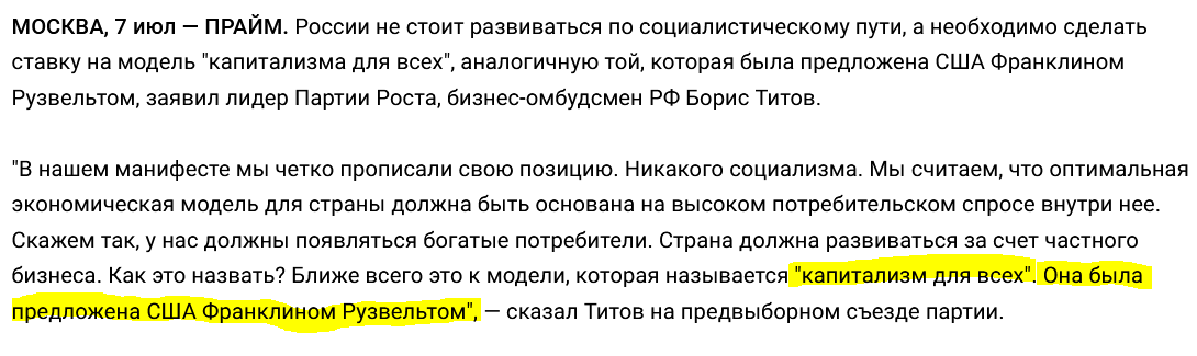 - Если посмотреть на все структурные изменения Нового курса Рузвельта, то прекрасно видно, что они давно внедрены в современной России (от пенсионного обеспечения до страхования вкладов). Отсылка Титова к практике Рузвельта это скорее всего пропагандистская уловка, рассчитанная на то, что мало кто знает детали политики этого американского президента.