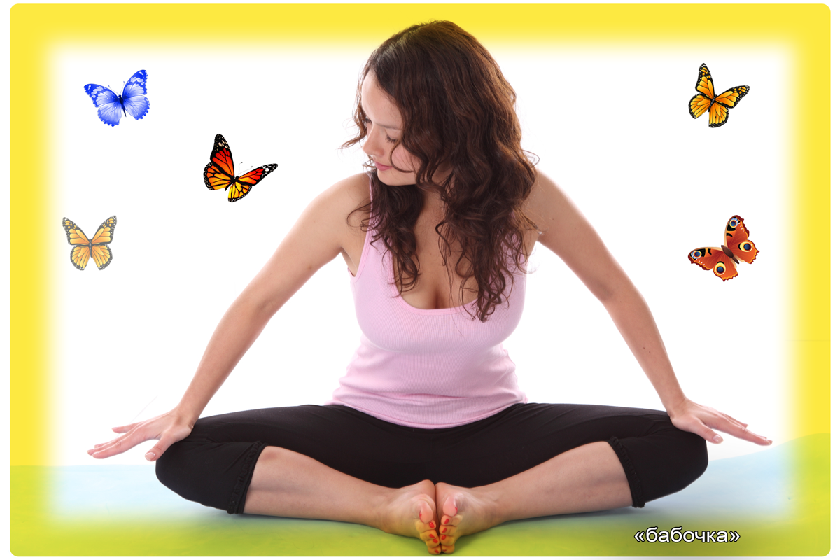 На испанском «бабочка» будет «mariposa», то есть такая вот поза - садимся на пол, подтягиваем пятки к себе как можно ближе, а колени опускаем на пол в разные стороны. И сидим. Удовольствие неописуемое. Чтобы автору научиться выполнять «бабочку», понадобилось три недели погрустить на одних персиках.