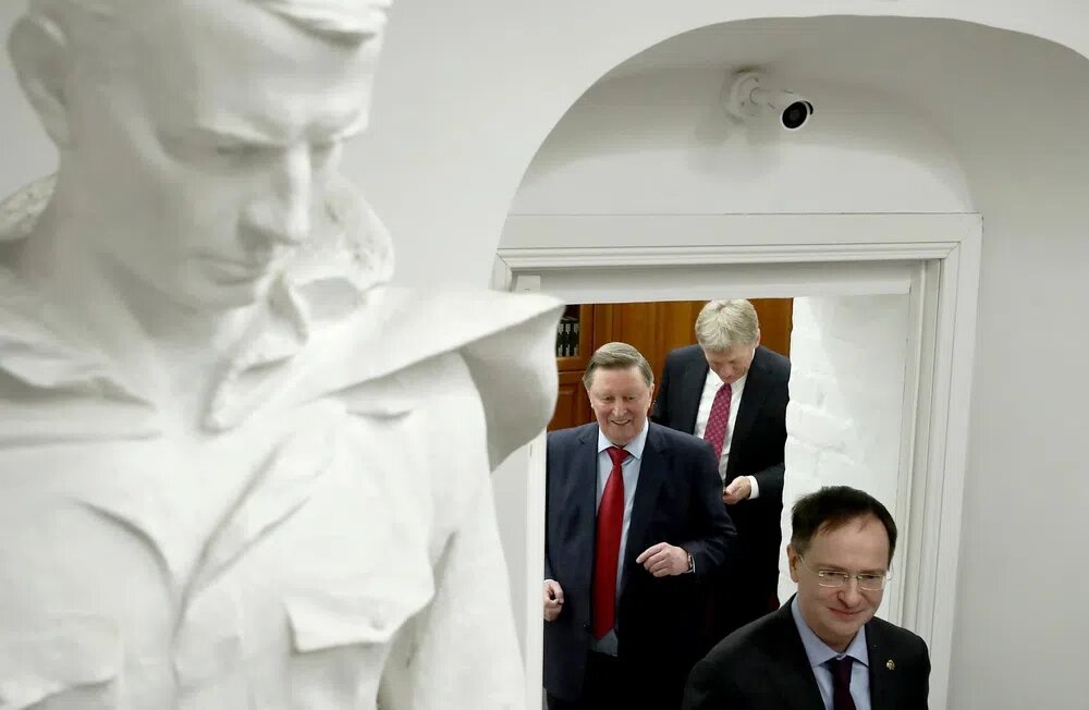 Владимир Мединский, Сергей Иванов и Дмитрий Песков (справа налево) во время открытия второй очереди библиотеки при штаб-квартире Российского военно-исторического общества. Фото: Валерий Шарифулин/ТАСС
