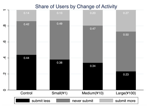 В целом, наши результаты показывают, что предоставление денежного стимула может помочь улучшить взаимодействие с пользователями и повысить отдачу от МООК. В литературе о стимулах в образовании существуют различия в том, какие входные задачи (например, чтение книги) или конечные результаты (например, результаты тестов) вознаграждаются. Один из выводов Фрайера (2011) заключается в том, что стимулы за вклад, такие как посещаемость, как правило, работают лучше, чем стимулы, вознаграждающие результаты, например более высокие оценки. Кларк и др. (2017) провели два полевых эксперимента с участием студентов колледжей и обнаружили, что постановка целей, основанных на проблемах, оказывает большее положительное влияние на результативность курса, чем постановка целей на основе результатов. Наш эксперимент вознаграждает студентов за выполнение домашних заданий, и поэтому положительный эффект воздействия перекликается с действенностью вознаграждения за конкретные задания.