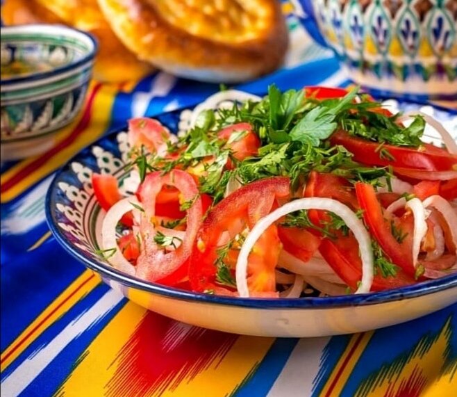 Для легкого летнего стола готовим вкусные узбекские салаты — и подаем их на стол в красивых ярких салатниках.
