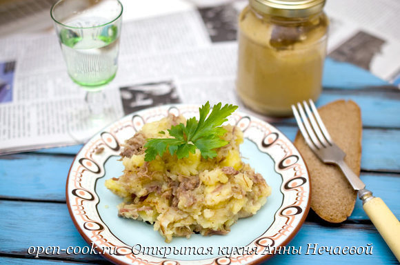 Картофельное пюре с тушенкой - это блюдо моего детства. В девяностые тушенка являлась праздничным продуктом и на столе была, естественно, не часто. Рядом с нашим маленьким городком была военная часть и на рынке частенько продавали тушенку из военных запасов. Качество у нее было отличное и купить можно было недорого. На всю жизнь я запомнила эти красивые башенки из солдатских консервов. И на всю жизнь полюбила эту вкуснятину. Как оказалось, не все знают, что так можно делать :) Так что делюсь рецептом. Но у меня в нем и лучок есть, и зелень, а на самом деле все готовилось намного проще. Особенно зимой было здорово кушать картошку с тушенкой вприкуску с домашними соленьями ))) Примерно на 4-6 порций: Картошку почистить и сложить в кастрюлю, залить водой и поставить на плиту. Варить до готовности. Солить в конце. Когда картошка сварится, слить воду и размять ее в пюре. Пока варится картошка, нужно заняться тушенкой. Лучше это дело начинать тогда, когда картошка уже будет во всю кипеть. Мо