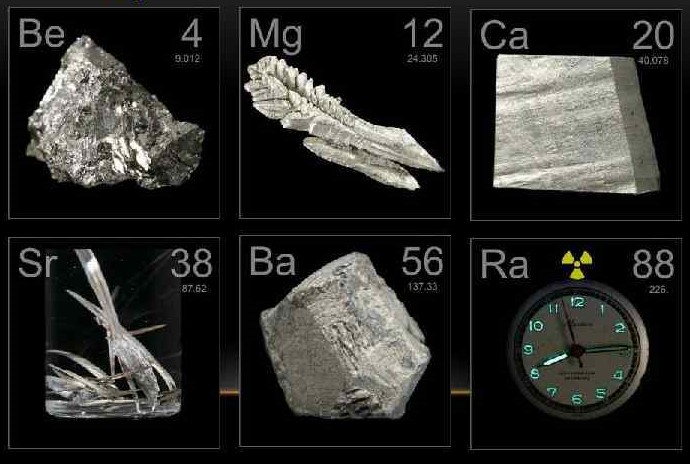 Элементы второй группы, немного менее реакционноспособные, чем их соседи по первой группе. В чистом виде они мягкие и блестящие, а при комнатной температуре остаются твердыми. Впервые они были открыты в XIX веке, они называются «щелочноземельными», потому что многие из них были обнаружены в необработанном виде в земной коре. Каждый элемент в этой группе горит особым цветом.