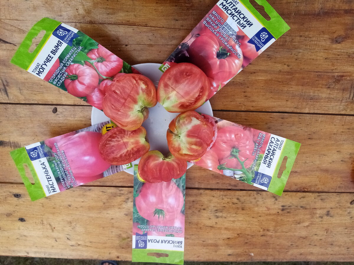 Красные и розовые томаты крупного и среднего размера от фирмы Семена Алтая, участвующие в сегодняшнем обзоре: Такая вот ромашка, сорта Могучее вымя, Алтайский сахарный, Алтайский мясистый, Настенька и Бийская роза. Алтайский сахарный Томат не самый крупный, но имеет массу достоинств. Мякоть нежная, сочная, вкусная. Этот сорт хорош и в свежем виде, и для приготовления соусов и соков. Шкурка плотная, но тонкая, хорошо снимается. Перевозить лучше не стоит (или в недозрелом виде). На улице растёт лучше, чем в теплице - плодов больше, крупнее и не растрескиваются. Не понравилось, что большие белые прожилки, это может быть из-за жары и недостатка кальция и калия, переизбытка азота (а так же болезнь, при которой деформируются и меняют цвет листья - столобур, или особенности сорта). В моём случае скорее всего недостаток кальция, потому что ещё и вершинная гниль была. Алтайский мясистый Тоже крупный и очень урожайные (учитывая этот год). Мякоть сочная, вкусная. Этот сорт в теплице выглядит луч