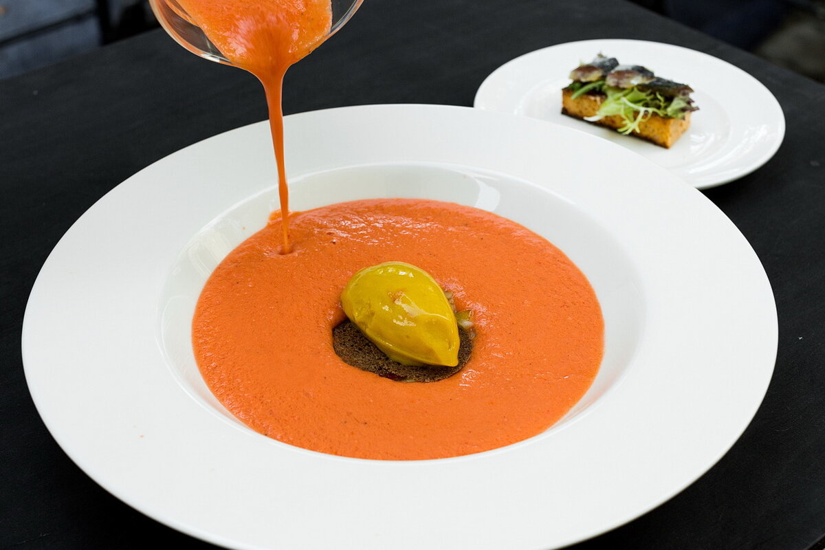 - Кладем сорбет из желтого перца сверху тартара, убираем кольцо и наливаем гаспачо по краю тарелки.