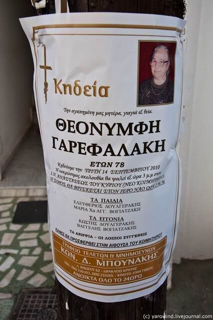 1. Много раз видел приклеенные на столбах постеры. Греческого я не знаю, но предполагаю, что это некрологи о тех, кто недавно умер. Кто этим занимается – приход или муниципалитет, я не знаю, но идея хорошая. Как-то она сближает. Кстати, живут греки достаточно много. На местном кладбище наибольший возраст умерших где-то в районе 75-85 лет, бывает и больше. Ну а раньше 65 умирать совсем неприлично.