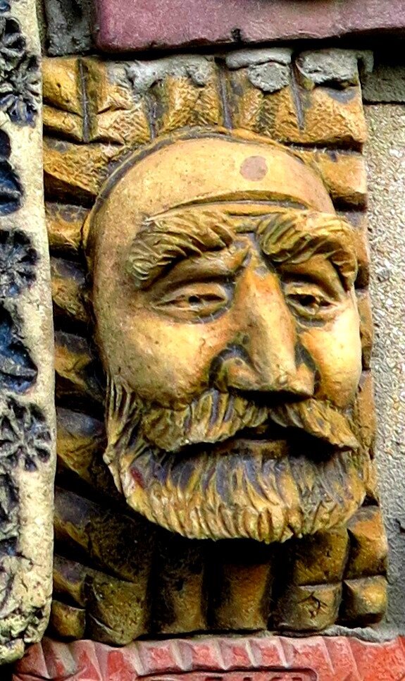 Но, чтобы найти, что-либо особенное, о чём не прочтёшь в путеводителях, надо совать свой нос в самые непотребные места. Вот там и можно увидеть то, ради чего стаптываются километрами башмаки. Что я и делаю в поездках. Дважды я заходил на одну улицу и дважды обшарпанные стены, куча наружной проводки, водо и канализационные трубы поверх фасадов, откручивали меня назад. Но, случайно, было прохладно и жена отправилась в отель переодеться, а я на открывшиеся полчаса, углубился внутрь. И нашёл-таки вот это чудо! Вся керамика в оформлении отчёта снята с этих стен. Я так тщательно занимался фотографированием, что хозяин, увидев мой неподдельный интерес, вышел из дома и пригласил меня внутрь. Я офонарел! Там такого на всех стенах, колоннах в интерьере! Я говорю, мне надо идти жену встречать, какая жалость. Он в ответ: - Ну так иди встречай и приходи с женой. Дальше мы офигевали с женой вместе. Его фишка в том, что он практически не применяет глазурь в керамике, а лепит из природных цветных