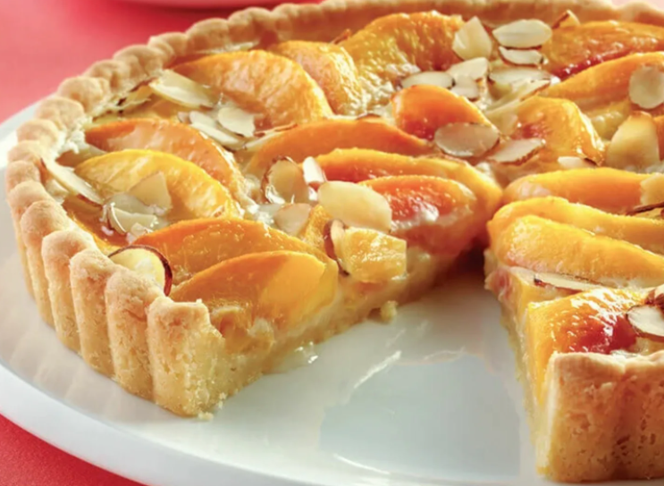 4. В форму выложить раскатанное тесто, наколоть вилкой. Выложить на тесто крем. В крем уложить персики. Сверху по же