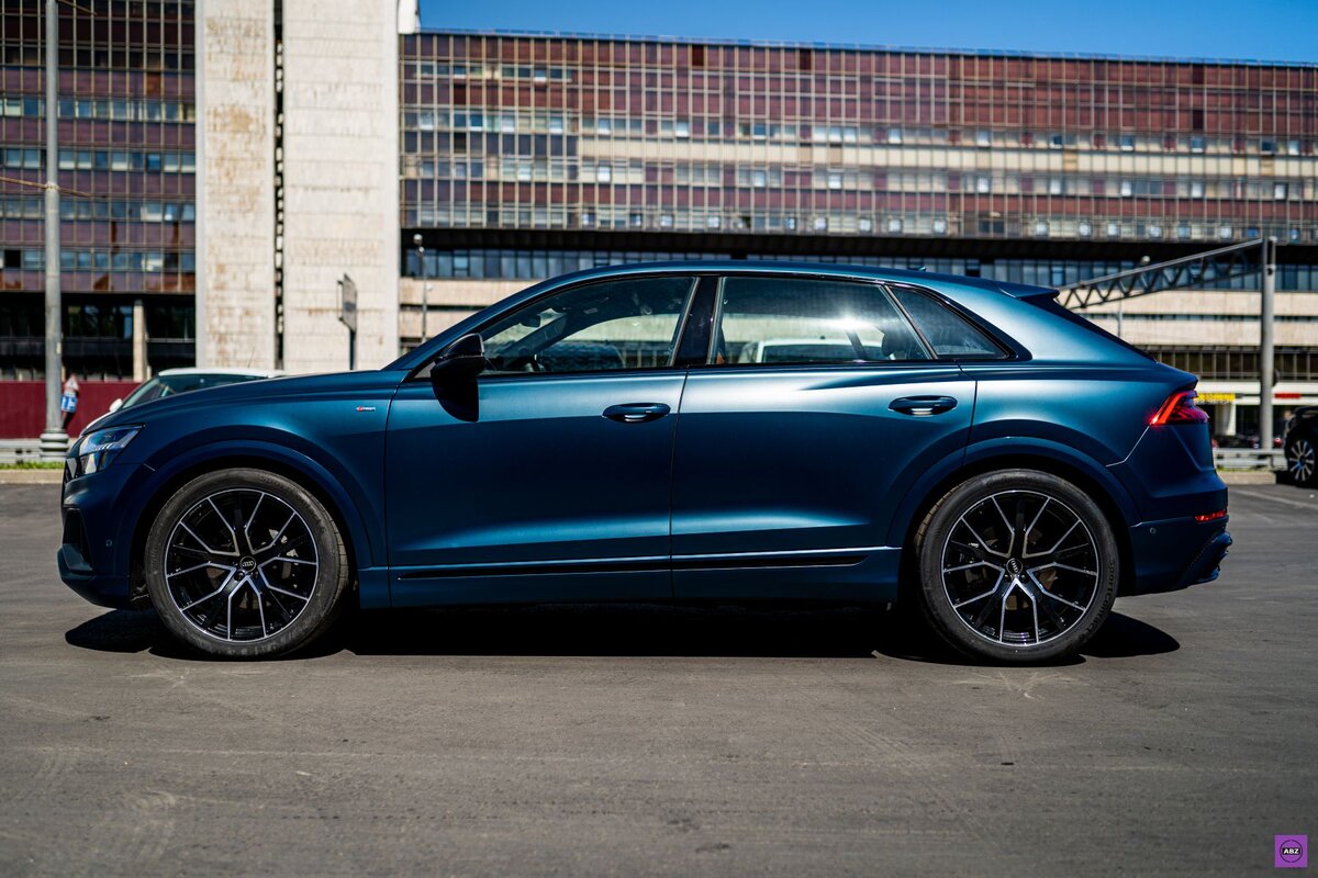 И снова в нашем детейлинг-центре Audi Q8. Дизайнеры немецкого бренда не поскупились на богатую палитру кузовных оттенков. Они отличаются своей уникальностью, под каждый углом и при разном освещении цвет раскрывается с новой стороны. Сегодня мы представляем на ваше обозрение новый кроссовер Audi Q8 в цвете синий металлик или, как он еще указан на сайте дилера, Galaxy Blue. Автовладелец захотел максимально защитить машину, а также улучшить свой комфорт во время поездок. Итак, что можно еще улучшить в такой прекрасной модели? Сейчас расскажем и покажем. В первую очередь защищаем лакокрасочное покрытие Сохранить кузов автомобиля в идеальном состоянии можно с помощью антигравийной полиуретановой пленки. Вместе с защитой можно сочетать стайлинг, например, как в данном варианте. В качестве защиты лкп этого кроссовера клиент выбрал матовую антиграйную полиуретановую пленку Llumar Platinum Matt и он не ошибся. Посмотрите сами. Под матовым полиуретаном цвет выглядит космическим. Такой эффект дас