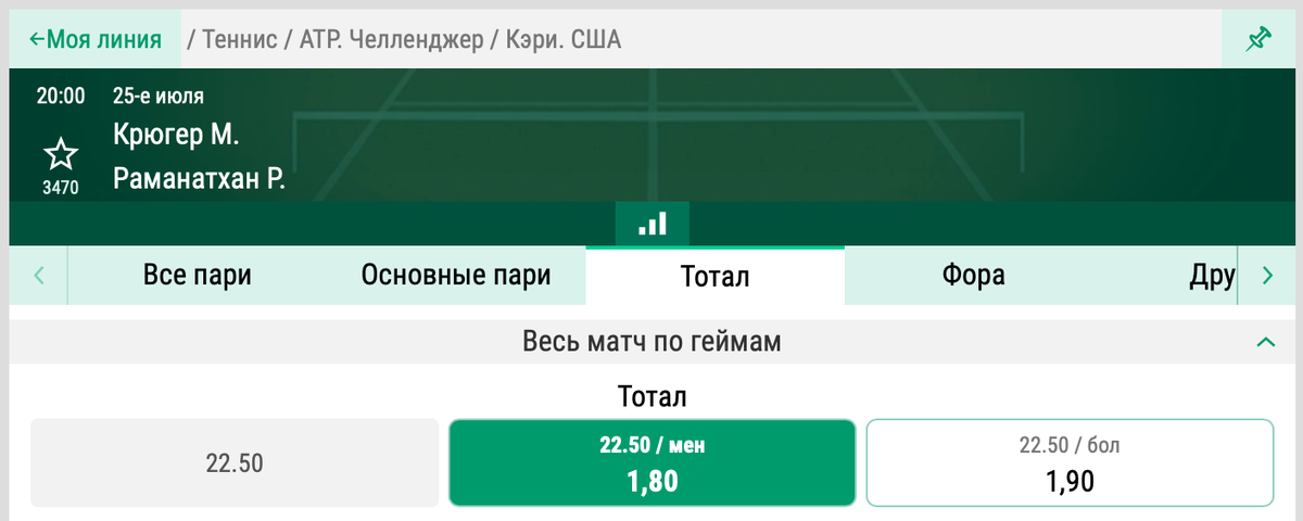 Заходим по линии на теннис. Описание к ставке: Крюгер меньше двух недель обыграл противника на травяном корте в Ньюпорте. Как пройдет их очная встреча на харде в борьбе за титул челленджера в Кэри? Крюгер последний раз завоевывал трофей на челленджере в Далласе в 2019-м году. И сейчас игрок близок к повторению успеха. В Кэри теннисист одолел Блумберга (4:6, 6:3, 7:6), Макхью (6:1, 7:6), Оливьери (6:2, 2:6, 6:3) и Нанду (6:3, 6:2), обеспечив себе место в решающем поединке. До текущего момента наилучшим достижением Крюгера в 2021-м году был выход в полуфинал челленджера в Литтл Роке. Раманатхан же в нынешнем сезоне не проходил даже дальше ⅛ финала. Поэтому его результат, показанный в Кэри, кажется еще более удивительным. Представитель Индии провел четыре трехсетовых поединка, в том числе, дважды отыгрываясь после проигранной партии. Но во всех случаях оказался сильнее оппонента, последовательно выбив из челленджера Ковачевича (6:4, 5:7, 6:4), Галарно (7:6, 4:6, 6:4), Гуннесварана (3:6, 7