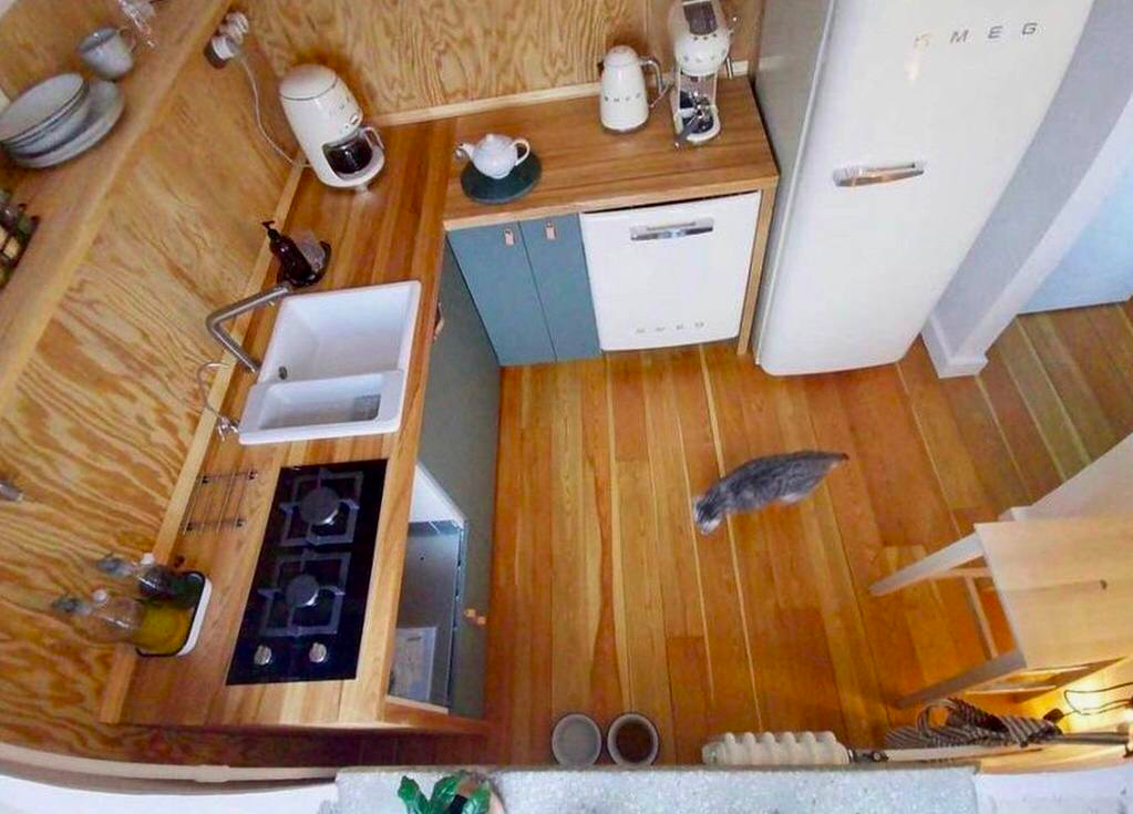 Сегодня мы побываем на кухне, которую хозяйка отремонтировала собственными руками. Стиль интерьера, который сменил прежнюю обстановку, можно условно назвать «ретро-скандинавским» – он действительно представляет собой любопытный микс традиционных для сканди приёмов, но изобилует деталями в стиле ретро. В квартире сохранены деревянные пол и окна, использована гипсовая лепнина и электрика в популярном сейчас ретро-стиле. Большая часть кухонной техники тоже выбрана из коллекции, которая пользуется неизменной популярностью у любителей 50-60 годов ХХ века. Выбранный стиль выглядит в этом доме очень естественно. Что неудивительно: квартира находится в доме, построенном в 1960 году. К приметам времени, помимо толстых стен и высоких потолков, можно отнести ещё и довольно узкие дверные проёмы и необычную планировку – например, вход в кухню сделан из гостиной. Любопытная деталь: двери в квартире использовались стандартные, но поскольку проёмы для них слишком узкие – 195 на 65 и 75 см – то при уст