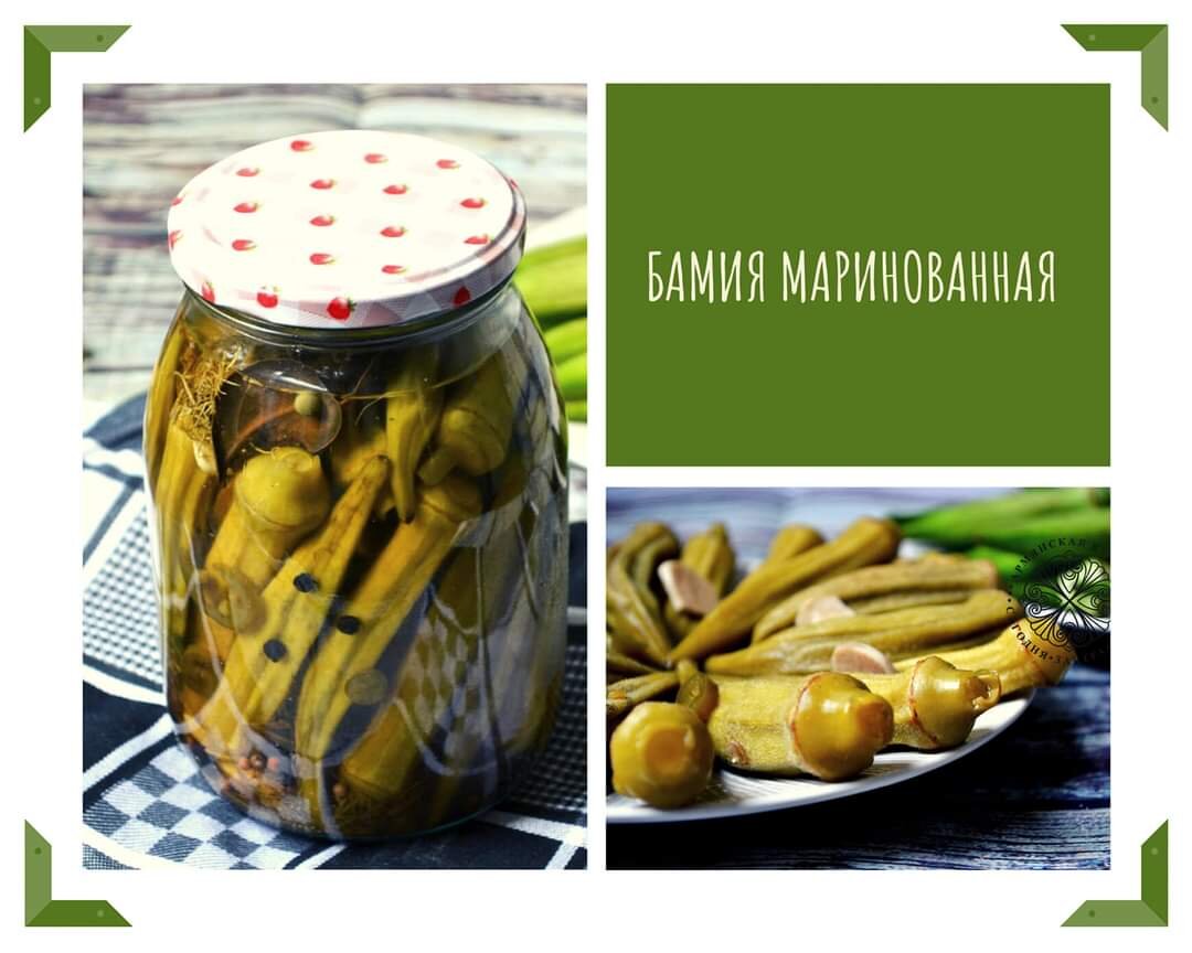 МАРИНОВАННАЯ БАМИЯ Моя любовь и слабость 🙂 Перебрать, промыть бамию, отрезать кончики хвостиков и поместить на 15-20 минут в подсоленную воду. Это делается для того, чтоб не было склизкости, которая свойственна бамие. Кстати, говорят, можно добавить и немного лимонной кислоты. Я не пробовала, поэтому подтвердить не могу. Затем воду слить, бамию промыть. Теперь можем начинать. Нам понадобится: Лавровый лист Чеснок Сухой укроп Острый перец Перец горошком Крупная соль Уксус Сахар Факультативно: листья сельдерея, кинзы или петрушки В простерилизованную банку уложить плотными рядами бамию, перекладывая специями и залить горячим маринадом. Для приготовления маринада: на 1 стакан горячей воды взять 0,5 ст. л. крупной соли, 1 ст. л. уксуса, 0,5 кусочка сахара. Тщательно размешать до полного растворения соли. Соли можно и побольше, зависит от ваших вкусовых предпочтений. Для недолгого хранения просто залить маринадом, закрыть крышкой и убрать на пару дней. Если вы собираете