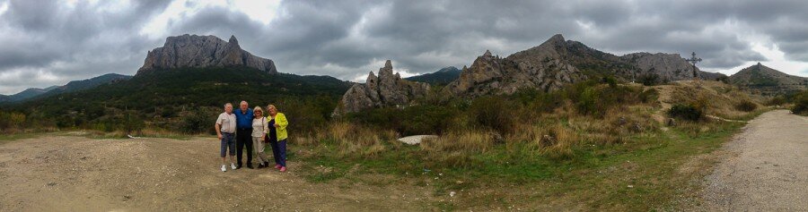 Каменный трезубец в правой части снимка называется скала Деликли-Кая, в переводе Дырявая Скала, а еще ее называют Скала Три сестры. Под скалой находятся подвалы винзавода "Солнечная Долина", в которых в бочках выдерживается "Черный Доктор". Каменный утес в левой части снимка - это гора Парсук-Кая, гора Кабан или гора Носорог.