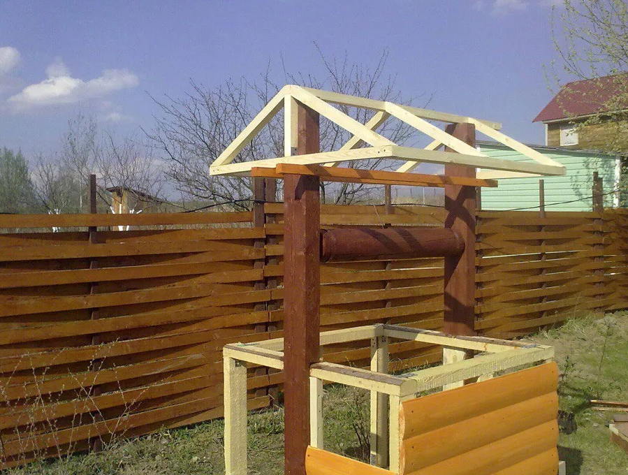 Домик для колодца - это не только элемент декора, но и элемент защиты. Для его постройки необходимо закупить деревянный брус, металлические прутья, уголки, вагонку или блокхаус, защитную пропитку, саморезы, краску, металлическую цепь, прочую фурнитуру для крепления дверцы. Первым делом необходимо измерять диаметр сооружения, с параллельных сторон колодца устанавливаются 2 стойки, которые соединяются при помощи деревянных брусьев. Для создания веретена выбирают толстое и прочное бревно. По центру торцов бревна делаются отверстия (2-3 см), в которые вставляются металлические пруты. С одной стороны прут загибается в виде металлической ручки. Прутья вставляют в заранее проделанные отверстия в стойках. К веретену прочно прикрепляется цепь с ведром. С лицевой стороны домик декорируют вагонкой, блокхайсом, камнем или кирпичом на усмотрение строителя. Для постройки конька крыши используют 2 деревянные доски. В зависимости от финансовых возможностей для материала крыши выбирают дерево, железо,