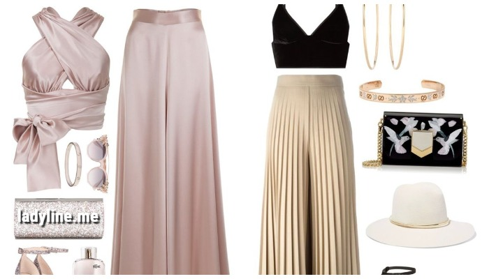 Следующий люксовый комплект одежды — это топ + широкие брюки с высокой посадкой. В приоритете, как однотонные наряды, так и вещи, украшенные вышивкой с золотой нитью. От дорогой женщины должно пахнуть богатством и шиком, добавьте пару капель шельфового парфюма.