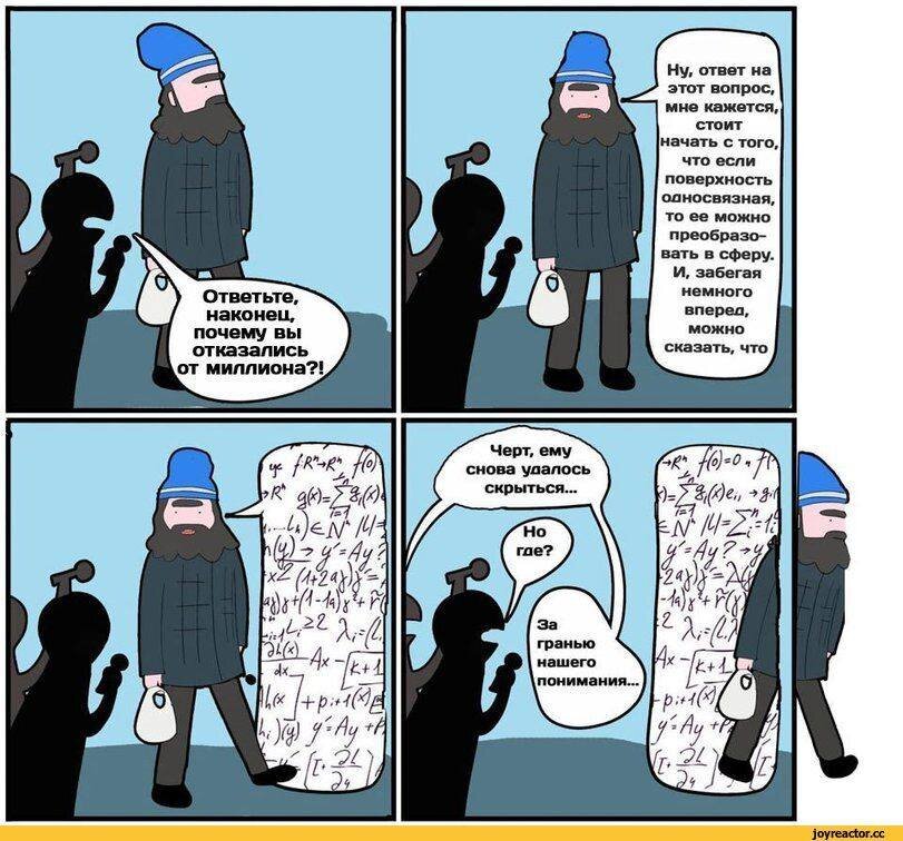 Чтобы уснуть на ночь почитал кое-что из высшей математики. Оказывается, интегралы уже 30 лет как не торт, топология рулит, зря только студентов мучают. Кроме того наткнулся на отличную статью о Григории Перельмане, перевод из НьюЙоркера. Ну, как было дело. Что доказал, почему отказался от премии, скандалы, интриги, расследования. Статья ч.1: https://vadda.livejournal.com/42798.html Статья ч.2: https://vadda.livejournal.com/43157.html Собственно, сам Гриша: http://lurkmore.to/Григорий_Перельман Тоже он на вики: https://ru.wikipedia.org/wiki/Перельман,_Григорий_Яковлевич Годная статья о матане, о сложном с юмором: http://lurkmore.to/Матан Вольный пересказ Лео Каганова (стишата): https://lleo.me/dnevnik/2010/03/29.html Исходная статья New Yorker (на английском): https://www.newyorker.com/mag.../2006/08/28/manifold-destiny Когда сабж хайпанул, о нем много всякой туфты публиковалось. Комсомолка вышла с фейковым кликбейтным интервью "Зачем мне миллион долларов? Я могу управлять Вселенной". С