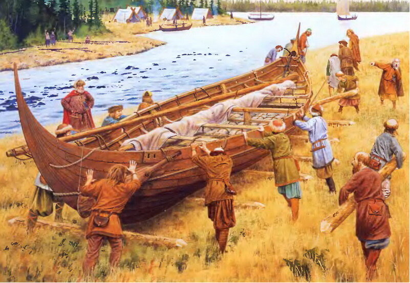 Хорошо идти на судах по воде, да еще по течению и с попутным ветром. А вверх по рекам? Надо либо грести постоянно, либо тянуть суда бечевой, как это делали бурлаки. По мере продвижения рЕки становятся всё уже, на пути всё чаще попадаются пороги и перекаты, в конце концов водный путь сужается, становится несудоходным и прекращается, упираясь в водораздел. Да, там по другую сторону холмистой гряды тоже текут реки, несущие свои воды в другое море. По ним также можно скользить по течению, а затем и под парусом, с попутным ветром. Но сначала надо его перейти. Преодолевать его неизбежно приходится сухопутным путем, т.е. тащить, волочить суда из верховьев рек одного бассейна в верховья рек другого. Водоразделы между бассейнами были узкими местами водных путей. Помимо сложностей перехода волоков, именно здесь караваны были наиболее уязвимы. Вокруг леса и болота, откуда в любой момент могут напасть враги. Идущие с караваном люди, товары и суда находятся на суше. Отгрести к другому берегу при приближении разбойников или ударить в весла и умчаться здесь невозможно. Команды волокут суда по суше, товары выгружены и лежат на берегу. Враждебные дикие племена, если они живут в окружающих лесах, несомненно могут использовать свое преимущество, напасть внезапно на медленно ползущий по суше караван и разграбить его.