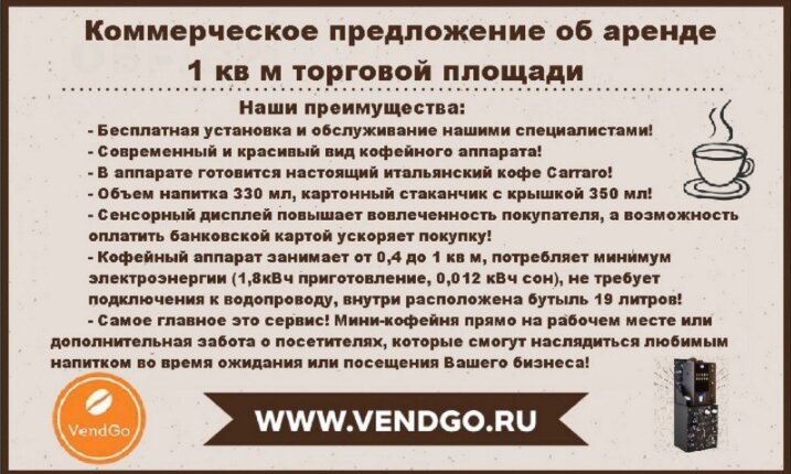 На сегодняшний момент существует большое количество вендинг-автоматов. Они выполняют различные функции, актуальными и востребованными являются кофейные. Отличная идея для бизнеса при небольшом бюджете — взять кофейный аппарат в аренду и поставить в зоне высокой проходимости. Выпить кофе или чай — одно из любимых занятий во время перерыва. Поэтому руководители крупных офисов могут поставить у себя кофейный автомат и, таким образом, получить лояльность от своих сотрудников и дополнительный доход. Работникам приятнее приходить на работу, зная, что там их ждет ароматный зерновой кофе. Кроме этого, вендинг актуален для больниц, торговых центров и рыночных площадок. Оборудование для кофейного вендинга Прежде чем принять решение о начале бизнеса на вендинге, нужно провести анализ рынка, конкурентов и потенциальных клиентов. Узнав целевую аудиторию, можно принимать решение о установке вендингового аппарата. Кофейный вендинг самый прибыльный и популярный. Окупаемость вложений происходит за кор