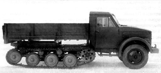 В 1950-е годы в вооруженных силах проходили испытания автомобили ГАЗ-63 с различными поисковыми системами и средствами дополнительного повышения проходимости на тяжелой местности. К ним относились экспериментальные образцы со съемными гусеницами и доработанный автомобиль с широкими арочными шинами низкого давления, имевший обозначение «Сибирь». Развитием неудачной конструкции полугусеничного грузовика АП-41 на шасси ГАЗ-51 считается последний опытный вариант, созданный в начале 1950-х годов на базе серийного грузовика ГАЗ-63. В нем была предпринята еще одна попытка создания более эффективного вездехода-тягача высокой проходимости за счет введения привода передних колес, упрощения и облегчения гусеничных движителей. На этой машине вместо задних колес монтировали легкие компактные движители с треугольным обводом коротких резинометаллических гусениц, верхней ведущей звездочкой и тремя штампованными опорными катками. Испытания вездехода, проведенные в 1952 – 1953 годах, так и не смогли удовлетворить все требования военных, и с появлением многоцелевого гусеничного транспортера ГАЗ-47 работы по полугусеничным грузовикам на заводе были прекращены.