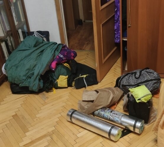 Всем привет! Начало истории о карельском отдыхе здесь. Каждый человек, собирающий в отпуск, сталкивается с проблемой - что взять с собой из вещей. И хоть как ни крути, но мало взять сложно, тем более на две недели. А как быть тем, кто собирается в поход на велосипеде, на те же две недели, без возможности стирать вещи по ходу, и с ограничением по объему и весу? Вот тут приходится извиваться ужом - что бы и рюкзак был не большой, но и не ходить в одном и том же весь маршрут. У меня сбор идет в три этапа. Сначала в комнате складывается ВСЁ, что может пригодится в дороге. 1. Коврики, спальники, палатки, тенты, рюкзаки, накидки от дождя, дождевики и прочее 2. Личные вещи - футболки, бриджи, купальники, носки и прочая, прочая, прочая.. Проходит несколько дней и ты понимаешь, что кучу личных вещей надо уменьшать... И так раза три - что-то докладывается, что-то убирается. В итоге получается тот обьем, который влезает в рюкзак, в нарульную велосумку и остаётся место для покупки попутно