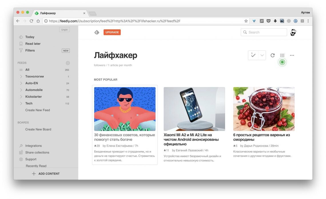 Откройте для себя что-то новое и запаситесь свежими идеями, которые пригодятся в работе и жизни. 1. Feedly Удобный агрегатор новостей, который по праву считается одним из лучших преемников Google Reader. Сервис доступен на всех платформах и помогает легко находить самое интересное в интернете, формируя новостные ленты. Feedly позволяет следить за обновлениями сайтов и блогов, создавать коллекции материалов и откладывать их для дальнейшего прочтения. 2. Pocket Pocket давно стал для многих инструментом отложенного чтения. Сервис может похвастаться отличной системой рекомендаций контента, основанной на читательских предпочтениях. Каждый день через Pocket проходят сотни тысяч материалов, из которых кураторы отбирают самые популярные и добавляют их ежедневную рассылку. 3. Flipboard Flipboard позиционируется как полноценный цифровой журнал, который верстаете вы сами. Вернее, это делают умные алгоритмы, исходя из указанных интересов. Вам же остаётся наслаждаться отобранным контентом,
