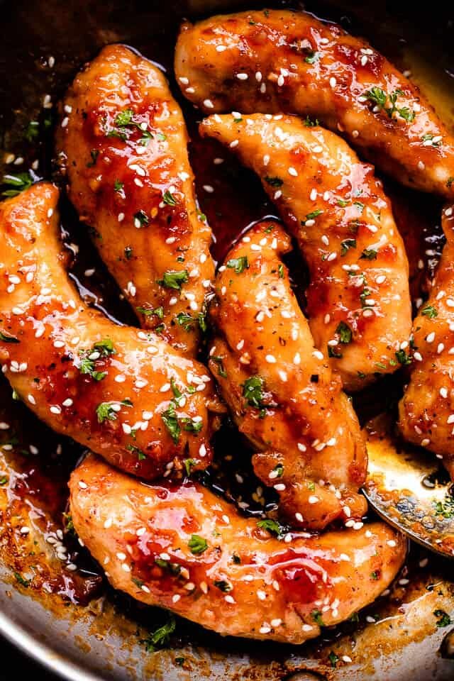 Нежнейшая курица в чесночно-медовом соусе. Вам понравится сладкий и чесночный соус, которым поливают хрустящую сочную курицу. Это рецепт в ресторанном стиле, из которого получится замечательный и вкусный домашний ужин. Запомните мои слова, этот рецепт мгновенно станет хитом! Обжаренные куриные филе в удивительном липком соусе, приготовленном с медом, острым соусом, чесноком и соевым соусом. Этот семейный фаворит очень легко приготовить, он абсолютно ВКУСНЫЙ и может быть на столе всего за 15 минут. ИНГРЕДИЕНТЫ РЕЦЕПТА: КАК ПРИГОТОВИТЬ КУРИНОЕ ФИЛЕ С МЕДОМ И ЧЕСНОКОМ. 5. Пока курица готовится, приготовьте соус: смешайте мед, чеснок, соевый соус, острый соус и уксус в небольшой миске и взбивайте до полного смешивания. 6. Полейте куриные грудки соусом и продолжайте готовить еще 2 минуты или пока соус не загустеет. 7. Снять с огня; украсить петрушкой и кунжутом (по желанию). 8. Подавать с соусом для сковороды. Что подавать с блюдом. Приятного вам аппетита!!! Источник:https://diethoo