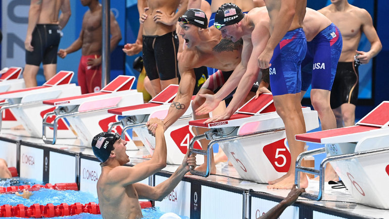 Российская команда в составе Андрея Минакова, Владислава Гринева, Владимира Морозова и Климента Колесникова заняла в эстафете только седьмое место. Золото досталось американцам, серебро у Италии, бронзу выиграли пловцы из Австралии.