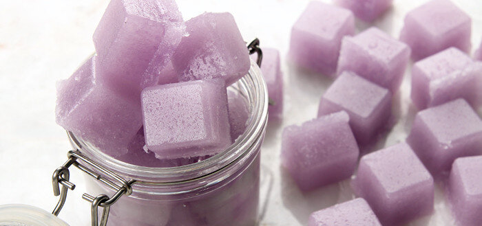 Всего за 20 минут вы сможете создать необычный лавандово-сахарный скраб, который сделает вашу кожу нежной и очистит от загрубевшей кожи. Такой скраб можно не только использовать самой, но и подарить подруге, ведь он будет выглядеть достаточно оригинально. Это рецепт, которой стоит попробовать. Для того, что бы сделать лавандовый сахарный скраб с основой Вам понадобится: Форма для льда (большие кубики) 450 гр. – сахарного песка 300 гр. – прозрачной основы для мыла 170 гр. – масла сладкого миндаля 80 гр. – глицерина 11 гр. – эфирного масла лаванды Фиолетовый краситель Пошаговый рецепт лавандового сахарного скраба Нарежьте мыльную основу кубиками и растопите на водяной бане или в микроволновой печи до полного растворения. Следите, что бы основа не закипела. Затем добавьте глицерин и масло сладкого миндаля в основу и перемешайте. Смесь станет мутной, а масла могут подняться на поверхность, это нормально. Добавьте жидкий краситель. Если краситель не растворяется полноценно в смеси, необхо