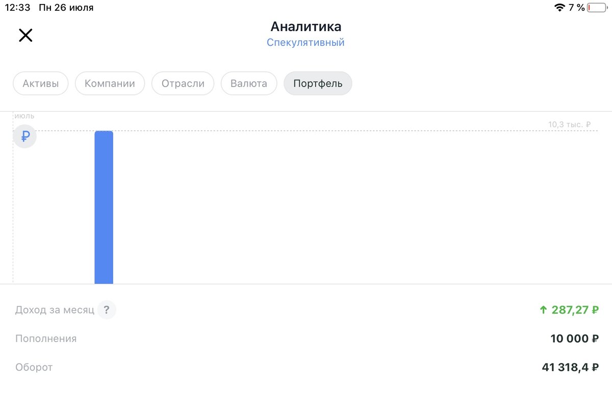 Я решил провести эксперимент и завёл спекулятивный брокерский счёт. На этот счёт положил 10 000 рублей и больше не планирую докладывать деньги. Наращивать размер депозита буду с помощью торговли. Посмотрим, что из этого получится. Итак, 26 июля 2021 года, старт 10 000 рублей. Здесь я буду делиться своими сделками. У меня включена маржинальная торговля. И первая сделка на этом счету – покупка 24 акций компании Северсталь на все плечи. Точка входа – 1721,6 (по рыночной цене) Стоп-лосс – 1715 Тейк-профит – 1740 Тейк стоит на закрытие утреннего гэпа, а стоп на локальном минимуме. Если мой тейк-профит сработает, я прибавлю около 4% к депозиту. На таких суммах это всё несерьезно, но надо же с чего-то начинать. Если тебе интересно следить за моим экспериментом – подписывайся на канал. Но помни, всё сказанное здесь не является индивидуальной инвестиционной рекомендацией. На момент публикации этого поста мой портфель выглядит вот так