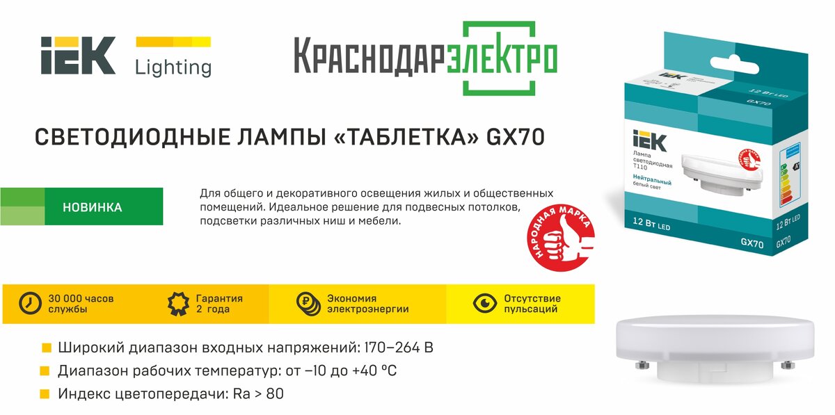 Новинка IEK: лампа-таблетка GX70 В наличии на складе светодиодные лампы мощностью 12, 15, 18, 20 Вт Для общего и декоративного освещения жилых и общественных помещений. Идеальное решение для подвесных потолков, подсветки различных ниш и мебели. Светодиодные лампы IEK являются современными источниками света и применяются в осветительных приборах, как альтернативные галогенным лампам с цоколем GU5.3, GU10 и лампам накаливания с цоколем Е14, Е27 источники света. Светодиодные лампы предназначены для использования в осветительных приборах наружного и внутреннего освещения объектов промышленного, коммерческого и бытового назначения. Соответствуют требованиям Технических регламентов Таможенного союза ТР ТС 004/2011, ТР ТС 020/2011, МЭК 62560, Постановления Правительства РФ от 10.11.2017 № 1356. · Срок службы в десятки раз больше, чем у ламп накаливания и галогенных. · Энергопотребление в разы ниже, чем у других ламп, экономия электроэнергии до 86%. · Выделяют значительно меньше тепла, чем ла