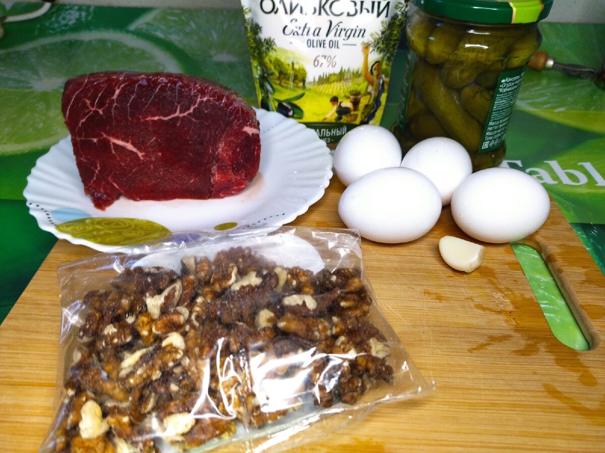 Как мне показалось, данный салат чем-то похож на салат "Мужской каприз", так что если Вам нравятся салаты с говядиной, давайте попробуем его приготовить, а затем попробуем на вкус. Что нам понадобится для приготовления: В первую очередь сварим говядину в подсоленной воде, затем её остудим. Теперь говядину нарезаем небольшим кубиком. Внимательно! Только половину нарезанной говядины отправляем в салатник и промазываем тонким слоем майонеза. Теперь тоже небольшим кубиком нарезаем огурцы, и тоже только половину огурцов выкладываем вторым слоем. Сверху снова тонкий слой майонеза. Поверх майонеза распределяем один зубчик тёртого / измельчённого чеснока. Все яйца так же нарезаем кубиком и только половину выкладываем третьим слоем. Поверх яиц так же идёт слой майонеза. С оставшимися ингредиентами повторите все слои в такой же последовательности. В последнюю очередь рубим грецкий орех и посыпаем им сверху салат. Салат готов! Мне он очень понравился, действительно получился вкусным. Однако на п
