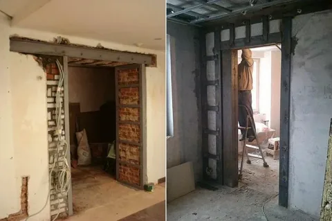 Сам по себе этот процесс довольно хлопотный, но при соблюдении определенных правил всё реально.Расскажу, как мы поднимали проёмы в загородном коттедже, расположенном в Подмосковье.Это кирпичный дом, работы нужно было выполнить в несущих стенах здания. В такой ситуации очень важно не нарушить целостность кладки, поэтому надо действовать с особой аккуратностью и избегать тряски при демонтаже. Самое сложное правильно перенести горизонтальную перемычку дверного блока. Если ее просто удалить, не укрепив верхний ряд кладки, то вся нагрузка ляжет на дверную конструкцию, которая не рассчитана на такое давление, и результатом может стать обвал стены. В нашем случае нужно было убрать бетонные перемычки дверного блока. Для этого мы установили над ними швеллеры 20х20, предварительно загрунтовав металл, чтобы предотвратить появление ржавчины.Швеллеры расположили на планируемой высоте проёма с двух сторон полками внутрь, вдолбили в кладку и стянули болтами. Затем замазали раствором и дождались ег
