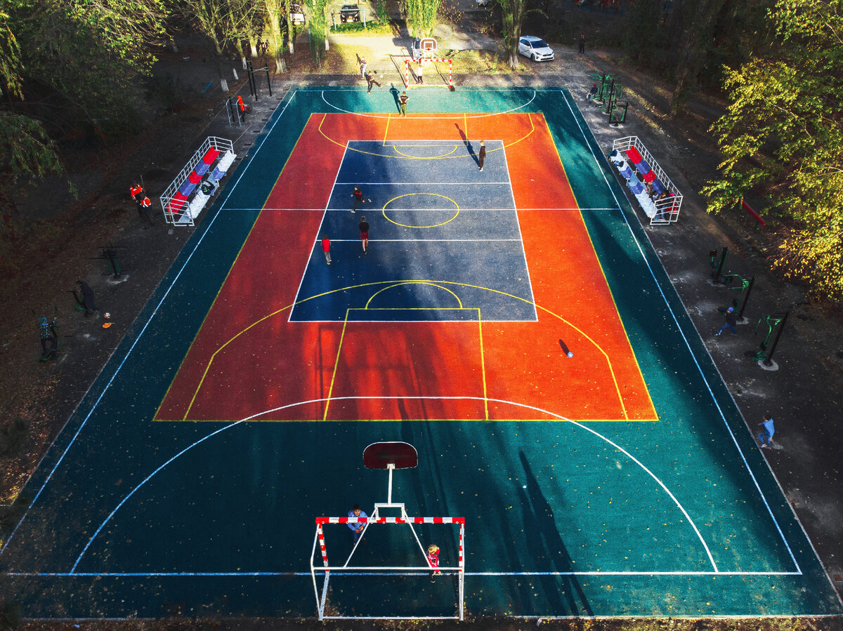 Уличные спортивные площадки чаще всего располагаются внутри дворовых комплексов и предназначены одновременно для нескольких видов спорта: Универсальные спортивные площадки могут быть любых размеров, но даже на маленькой площади (от 15х30м) возможно обустроить территорию под разные виды спорта благодаря нанесению нужных разметок. Универсальная спортивная площадка должна быть: Так как на площадке играют дети, то самое важное — сделать покрытие максимально травмобезопасным! Мы рекомендуем покрытие из резиновой крошки, которое состоит из резинового гранулята, специального полиуретанового клея и красящего пигмента. Преимущества покрытия из резиновой крошки: Благодаря своим свойствам, покрытие из резиновой крошки обеспечит безопасность детей во время спортивных игр и бега. Наши универсальные спортивные площадки соответствуют всем современным требованиям, предъявляемым к плоскостным спортивным сооружениям для массовых занятий физической культурой. О нас Наши реализованные проекты Зака