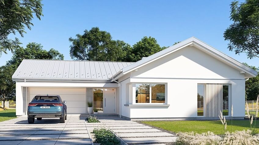 Приветствую читателей моего канала. В этой публикации предлагаю вашему вниманию проект дома 129.19 м2 и гаражом 38 м2. Архитектурный стиль дома - современный. Чёткие прямые линии, минимум архитектурных элементов и изысков. Конфигурация и внешний облик продиктованы функциональностью планировки. Пластика главного фасада достигается вырезанным из общего объёма крыльца и въезда в гараж. Ворота в цвет штукатурки. Угловое окно из спальни подчёркивает современность стиля. Терраса в приватной зоне также спроектирована в общем объёме, имеет панорамное остекление дверей, имеет верхнюю подсветку и скрыта от посторонних глаз. Стеклянные двери визуально смягчают границу между гостиной и окружающим ландшафтом. Архитектура дома проста, лаконична и элегантна, как белый рояль. Планировка дома достаточно функциональна для семьи из пяти человек (одну спальню можно оставить для гостей). Из прихожей можно попасть как в жилую зону, так и в гараж. Кухня имеет свою кладовую и зонирована от обеденн