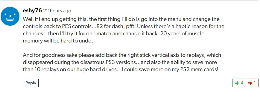 («Если мы получим это в итоге, то первым делом я зайду в настройки и верну все к классике PES. Нет причин для изменений, я попробую один раз и верну обратно. 20 лет мышечной памяти тяжело отменить»).