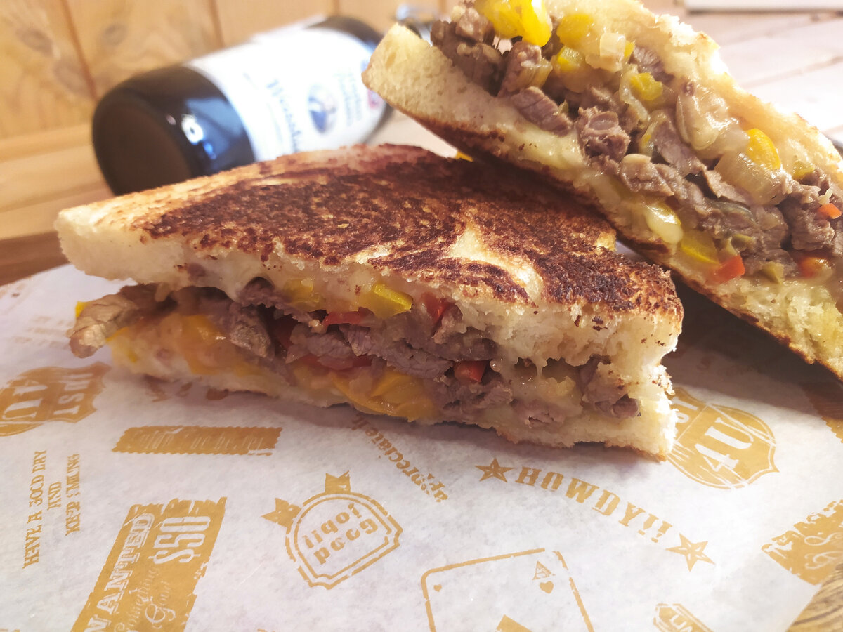 Сочетание жареного стейка и жаренного перца напоминает чизстейк, но мясо здесь сладковатое и интенсивнее и по вкусу из-за корейского маринада. На 3 сэндвича 6 больших кусков хлеба для сэндвичей