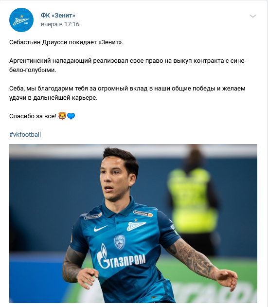 Здравствуйте, уважаемые подписчики и гости моего канала !!! На официальном сайте сине-бело-голубых появилась новость об уходе из команды Себастьяна Дриусси. В связи с этим логично предположить, что аргентинская эпоха в "Зените" скорее всего подошла к концу. Да, есть еще Эмануэль Маммана, но во-первых, он в настоящее время взят в аренду фк "Сочи". А во-вторых, остался всего лишь год контракта, который судя по всему продлён не будет. Поэтому, предлагаю сейчас подвести кое-какие итоги за все время пребывания футболистов из солнечной Аргентины в северной столице. Итак, когда в июне 2017 года клуб с берегов Невы возглавил сеньор Манчини, то перед селекционным отделом "Зенита" была поставлена задача о покупке представителей "Альбиселесте". Почему футболисты именно этой страны, заинтересовали итальянца ? Как сказал сам экс-рулевой петербуржцев: "А что касается аргентинских игроков, то они привлекают меня своими бойцовскими качествами, и у меня есть опыт работы с ними." Также из некоторых