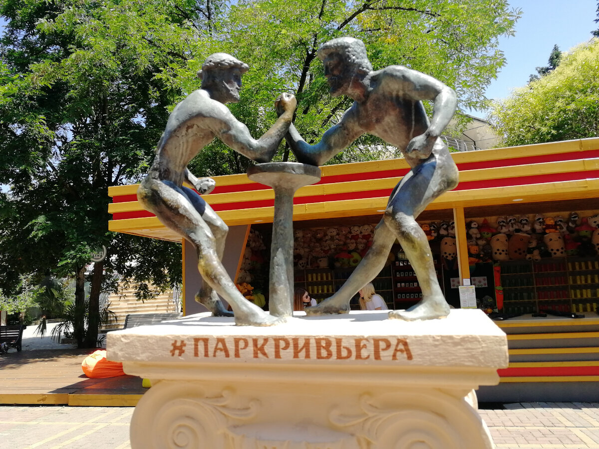 В парк Ривьера ездили в третий день своего пребывания на курортах Краснодарского края, о чем подробно рассказала здесь. Сейчас только про парк. Итак, находится в Центральном районе Сочи. На территории его расположен дельфинарий, конный театр, океанариум, комната страха, мини-зоопарк, множество аттракционов и зон отдыха. Вход на территорию парка бесплатный, во все дополнительные активности уже нужно заплатить. На входе - интерактивное табло с анимированным рассказом об истории парка. В принципе, если вы - бывалые путешественники и бывали в тематических парках развлечений, типа Сочи-Парка и Порт-Авентуры, то тут вам будет скучновато. На закрытые площадки мы сейчас ходить не рискнули - нового ничего, деньги не рисуем, а эпидобстановка напряженная. В дельфинарий еще б может сходили (хотя и слышали все эти истории про то, как животных дрессируют жестоко), но опоздали на начало представления, ждать не стали. Погуляли и посмотрели инфраструктуру, посмотреть есть на что. Красивая зелень, я