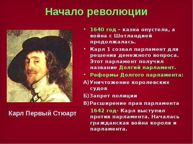 Середина XVII века для Англии была достаточно сложным периодом, т.к. обострились противоречия между королем и парламентариями. В 1628 году была опубликована брошюра о привилегиях и одновременно с этим парламент предложил Карлу I петицию о праве, в которой говорилось об исключительных правах законодателей на вотирование налогов. Петиция была одобрена королем, но это не спасло от напряженности в стране. Очередное обострение обстановки произошло в 1629 г., после которого парламент был распущен и началось единоличное правление короля. За время единоличного правления (1629-1640) король не смог стабилизировать ситуацию. В результате военные неудачи и дефицит финансов вынудили Карла I созвать парламент, который получил название Короткого (работал с 13 апреля по 5 мая 1640 г.). Коротким он стал потому, что палата общин не удовлетворила просьбу короля о предоставлении субсидии на ведение войны с шотландцами, а занялась рассмотрением его единоличного правления. Парламент был распущен, но без нег
