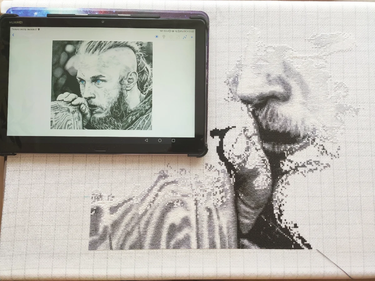 Итак, начнем с Рагнара. В прошлый раз я показала, как удалось побольше повышивать в углу работы.
