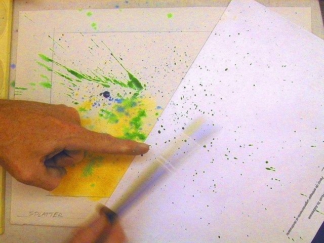 Данная техника не сложная, но дает популярный сегодня эффект скетчинга. Просто наберите на кисть краску и начните постукивать щетиной кисти по пальцу так, чтобы брызги хаотично разлетались